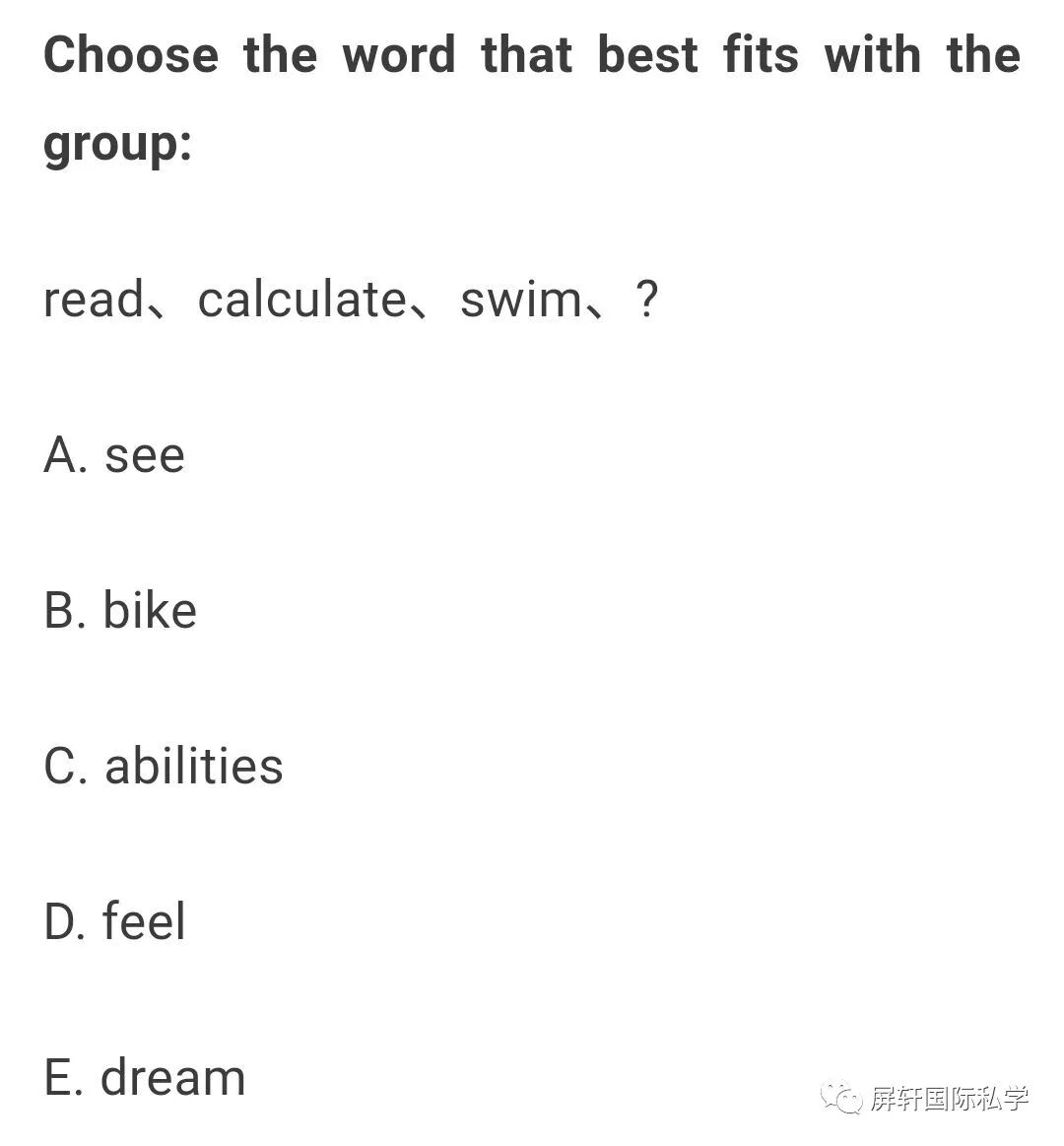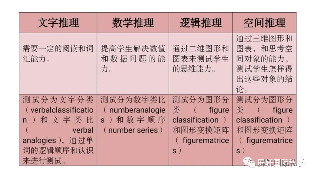 (1)CAT4测试包含四项推理测试,分别为文字推理(verbal reasoning),数字推理(quantitative reasoning),逻辑推理(non–verbalreasoning)和空间推理(spatial reasoning),每项推力测试包含两份试卷。这些测试为学生提供对于学习有关的核心能力的全面理解。